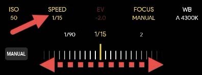 در هر صورت بعد از ضربه زدن روی گزینه‌ی Speed، از طریق اسلایدر پایینی می‌توانید سرعت شاتر را به راحتی کم و زیاد کنید. در این زمینه باید آزمون و خطا کنید تا با توجه به محیط بتوانید بهترین سرعت شاتر را برای نوردهی طولانی پیدا کنید.