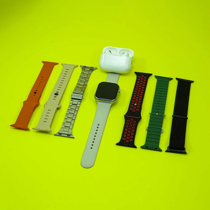 دارای هفت بند با طرح ها و رنگ های متفاوت + هندزفری Airpod Pro طرح اپل